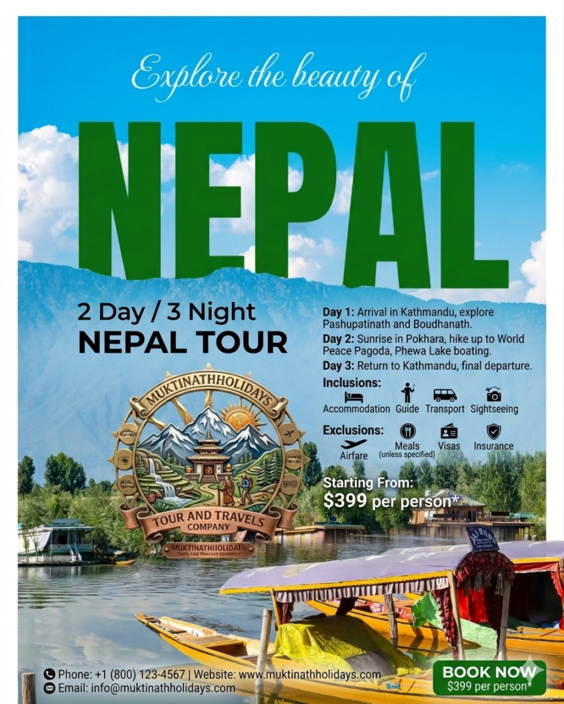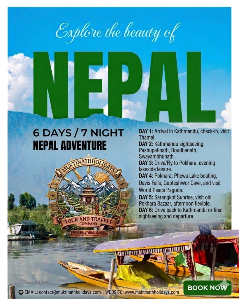 journey begins with the sacred Pashupatinath Aarati in Kathmandu, followed by a scenic drive to Pokhara. From there, fly to Jomsom for a life-changing visit to Muktinath Temple (3,800m) to bathe in the 108 holy waterspouts. Explore the World Peace Pagoda, Pumdikot Shiva Statue, and the mystical Jwala Mai eternal flame.