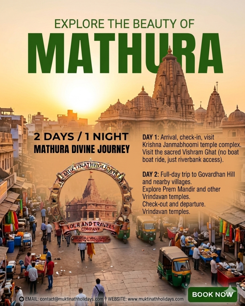 Shri Krishna Janmabhoomi in Mathura, the exact birthplace of the Lord. In the evening, lose yourself in the mystical charm of Vrindavan, where the chants of “Radhe Radhe” fill the air. Witness the architectural grandeur of the Prem Mandir as it illuminates at night and experience the deep devotion at the world-famous Banke Bihari Temple.
